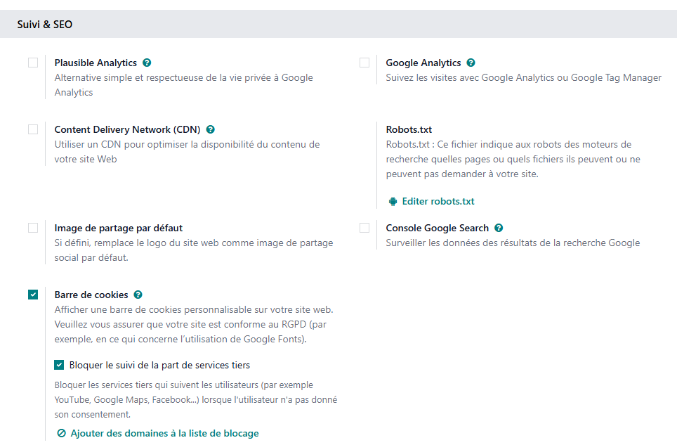 Lors de la consultation du site, certaines données techniques peuvent être collectées automatiquement par l'infrastructure Odoo :